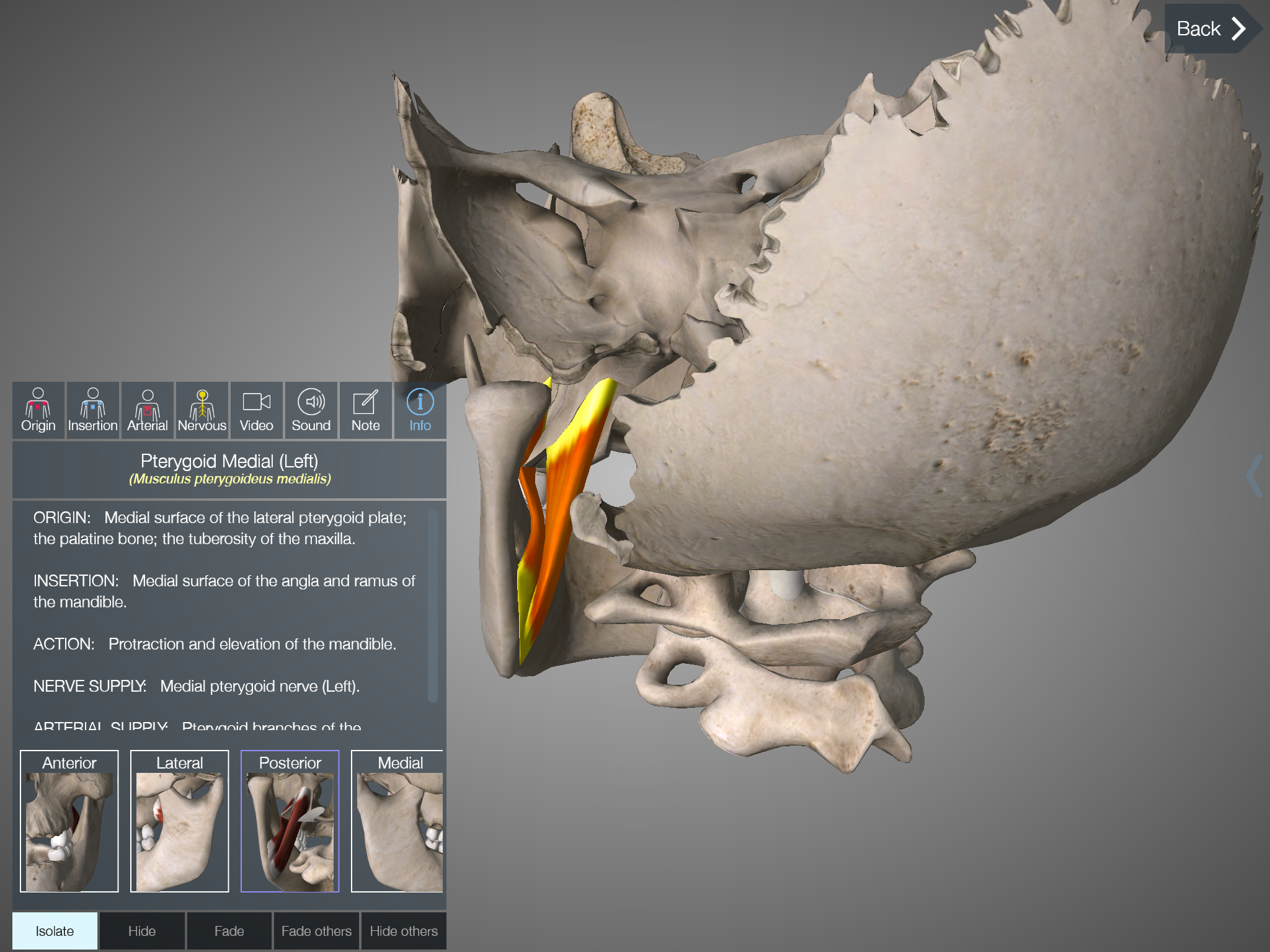 The bottom left pin identifies the Medial Pterygoid. The upper right pin identifies the Lateral Pterygoid. This lateral view illustrates why working inside the jaw makes better sense for effective work on these muscles.